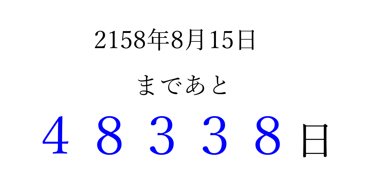 2158年8月15日(火)まで あと 99999 日です 追加すると、トップページからすぐ選べるようになります ※2026/04/11現在の結果です。 最新の状態に更新する ↓シェアして、タイムライン上にカウントダウンを表示しよう!↓ 📤 この結果を共有する Tweet シェア Threads Bluesky 別の日付でカウントダウン 2158年8月のカレンダー このページをブックマークに追加すると、いつでもカウントダウンを確認できます。 (PC: Ctrl+D / Mac: ⌘+D) hitome-notes.comでは以下のページも運営しています。 指定日と期間から日付を計算 | ガチャ確率計算・シミュレーション | プライバシー・ポリシー 運営者:Avocado