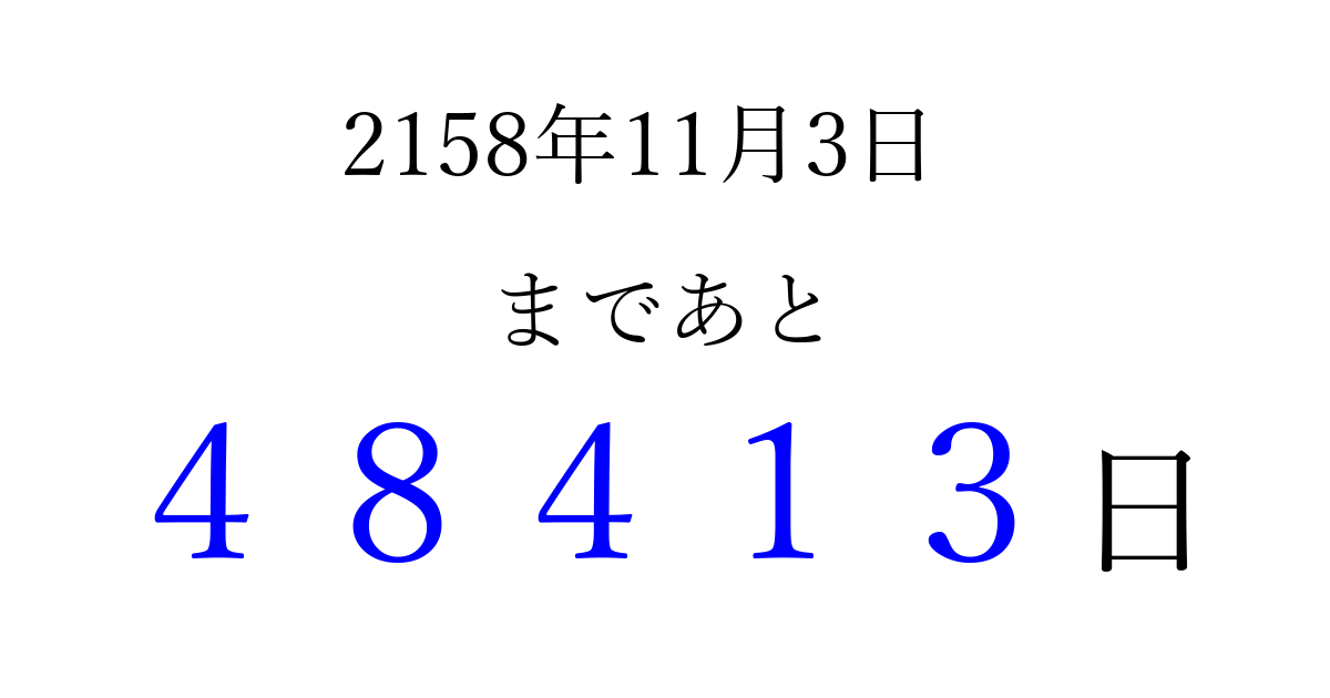2158年11月3日(金)まで あと 99999 日です 追加すると、トップページからすぐ選べるようになります ※2026/04/16現在の結果です。 最新の状態に更新する ↓シェアして、タイムライン上にカウントダウンを表示しよう!↓ 📤 この結果を共有する Tweet シェア Threads Bluesky 別の日付でカウントダウン 2158年11月のカレンダー このページをブックマークに追加すると、いつでもカウントダウンを確認できます。 (PC: Ctrl+D / Mac: ⌘+D) hitome-notes.comでは以下のページも運営しています。 指定日と期間から日付を計算 | ガチャ確率計算・シミュレーション | プライバシー・ポリシー 運営者:Avocado