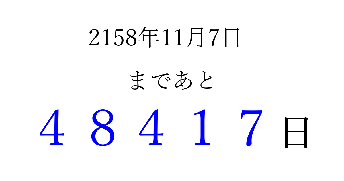 2158年11月7日(火)まで あと 99999 日です 追加すると、トップページからすぐ選べるようになります ※2026/04/16現在の結果です。 最新の状態に更新する ↓シェアして、タイムライン上にカウントダウンを表示しよう!↓ 📤 この結果を共有する Tweet シェア Threads Bluesky 別の日付でカウントダウン 2158年11月のカレンダー このページをブックマークに追加すると、いつでもカウントダウンを確認できます。 (PC: Ctrl+D / Mac: ⌘+D) hitome-notes.comでは以下のページも運営しています。 指定日と期間から日付を計算 | ガチャ確率計算・シミュレーション | プライバシー・ポリシー 運営者:Avocado