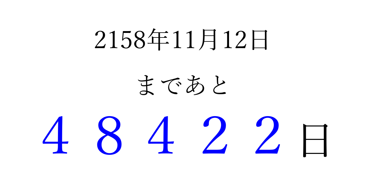 2158年11月12日(日)まで あと 99999 日です 追加すると、トップページからすぐ選べるようになります ※2026/04/16現在の結果です。 最新の状態に更新する ↓シェアして、タイムライン上にカウントダウンを表示しよう!↓ 📤 この結果を共有する Tweet シェア Threads Bluesky 別の日付でカウントダウン 2158年11月のカレンダー このページをブックマークに追加すると、いつでもカウントダウンを確認できます。 (PC: Ctrl+D / Mac: ⌘+D) hitome-notes.comでは以下のページも運営しています。 指定日と期間から日付を計算 | ガチャ確率計算・シミュレーション | プライバシー・ポリシー 運営者:Avocado