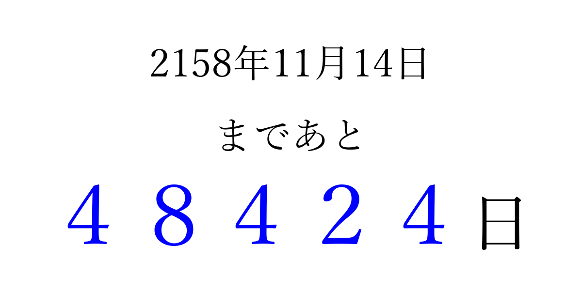 2158年11月14日(火)まで あと 99999 日です 追加すると、トップページからすぐ選べるようになります ※2026/04/16現在の結果です。 最新の状態に更新する ↓シェアして、タイムライン上にカウントダウンを表示しよう!↓ 📤 この結果を共有する Tweet シェア Threads Bluesky 別の日付でカウントダウン 2158年11月のカレンダー このページをブックマークに追加すると、いつでもカウントダウンを確認できます。 (PC: Ctrl+D / Mac: ⌘+D) hitome-notes.comでは以下のページも運営しています。 指定日と期間から日付を計算 | ガチャ確率計算・シミュレーション | プライバシー・ポリシー 運営者:Avocado