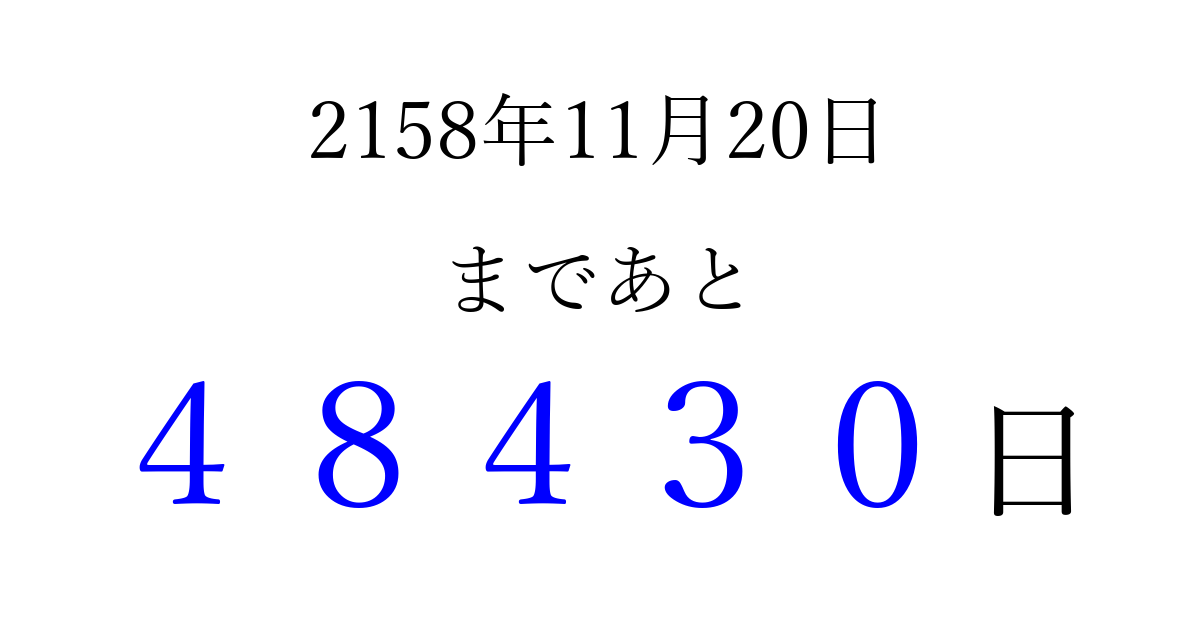 2158年11月20日(月)まで あと 99999 日です 追加すると、トップページからすぐ選べるようになります ※2026/04/16現在の結果です。 最新の状態に更新する ↓シェアして、タイムライン上にカウントダウンを表示しよう!↓ 📤 この結果を共有する Tweet シェア Threads Bluesky 別の日付でカウントダウン 2158年11月のカレンダー このページをブックマークに追加すると、いつでもカウントダウンを確認できます。 (PC: Ctrl+D / Mac: ⌘+D) hitome-notes.comでは以下のページも運営しています。 指定日と期間から日付を計算 | ガチャ確率計算・シミュレーション | プライバシー・ポリシー 運営者:Avocado