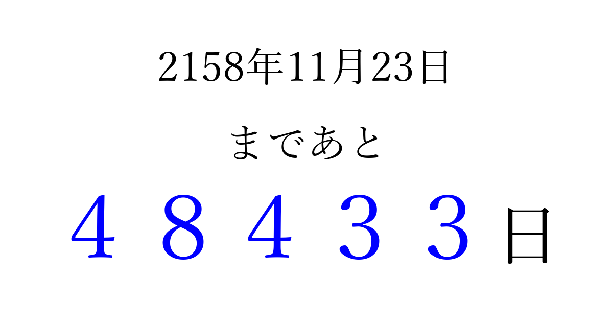2158年11月23日(木)まで あと 99999 日です 追加すると、トップページからすぐ選べるようになります ※2026/04/16現在の結果です。 最新の状態に更新する ↓シェアして、タイムライン上にカウントダウンを表示しよう!↓ 📤 この結果を共有する Tweet シェア Threads Bluesky 別の日付でカウントダウン 2158年11月のカレンダー このページをブックマークに追加すると、いつでもカウントダウンを確認できます。 (PC: Ctrl+D / Mac: ⌘+D) hitome-notes.comでは以下のページも運営しています。 指定日と期間から日付を計算 | ガチャ確率計算・シミュレーション | プライバシー・ポリシー 運営者:Avocado