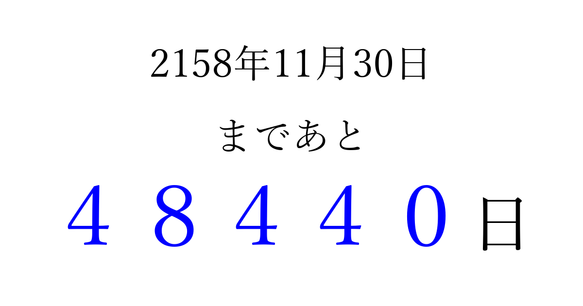 2158年11月30日(木)まで あと 99999 日です 追加すると、トップページからすぐ選べるようになります ※2026/04/16現在の結果です。 最新の状態に更新する ↓シェアして、タイムライン上にカウントダウンを表示しよう!↓ 📤 この結果を共有する Tweet シェア Threads Bluesky 別の日付でカウントダウン 2158年11月のカレンダー このページをブックマークに追加すると、いつでもカウントダウンを確認できます。 (PC: Ctrl+D / Mac: ⌘+D) hitome-notes.comでは以下のページも運営しています。 指定日と期間から日付を計算 | ガチャ確率計算・シミュレーション | プライバシー・ポリシー 運営者:Avocado