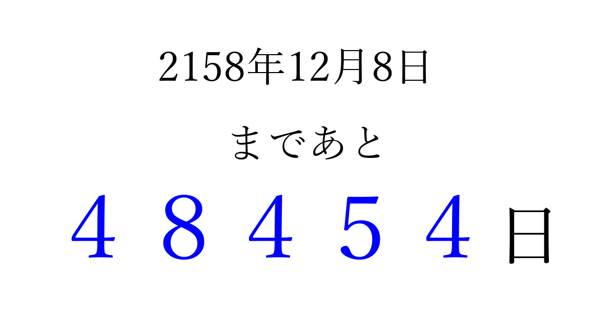 2158年12月8日(金)まで あと 99999 日です 追加すると、トップページからすぐ選べるようになります ※2026/04/10現在の結果です。 最新の状態に更新する ↓シェアして、タイムライン上にカウントダウンを表示しよう!↓ 📤 この結果を共有する Tweet シェア Threads Bluesky 別の日付でカウントダウン 2158年12月のカレンダー このページをブックマークに追加すると、いつでもカウントダウンを確認できます。 (PC: Ctrl+D / Mac: ⌘+D) hitome-notes.comでは以下のページも運営しています。 指定日と期間から日付を計算 | ガチャ確率計算・シミュレーション | プライバシー・ポリシー 運営者:Avocado