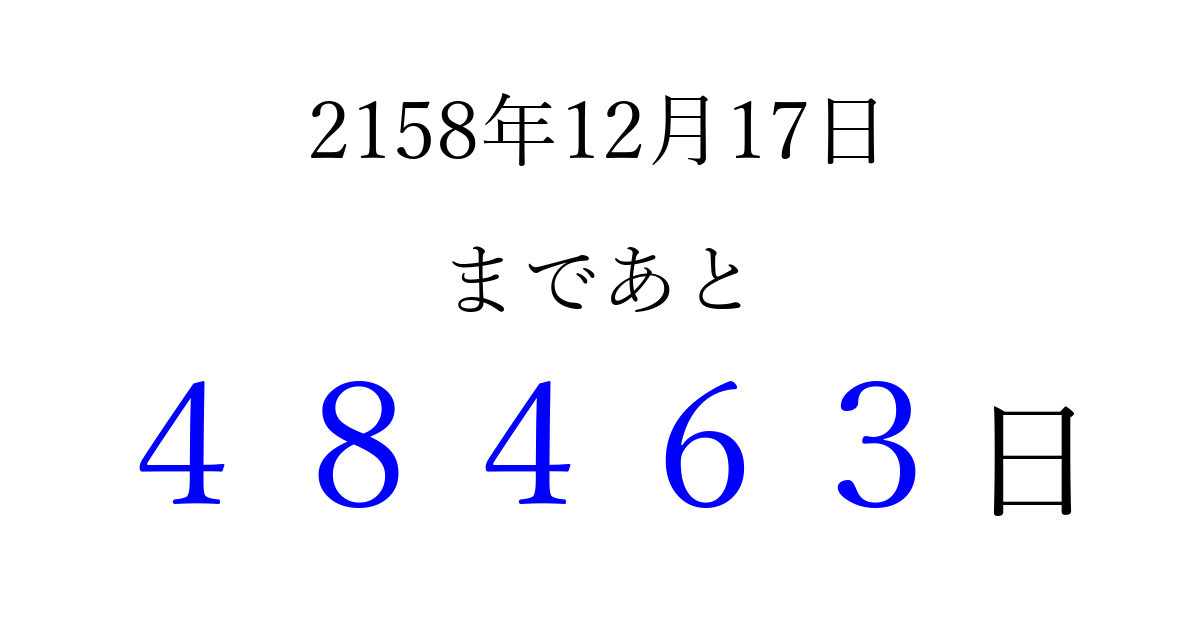 2158年12月17日(日)まで あと 99999 日です 追加すると、トップページからすぐ選べるようになります ※2026/04/10現在の結果です。 最新の状態に更新する ↓シェアして、タイムライン上にカウントダウンを表示しよう!↓ 📤 この結果を共有する Tweet シェア Threads Bluesky 別の日付でカウントダウン 2158年12月のカレンダー このページをブックマークに追加すると、いつでもカウントダウンを確認できます。 (PC: Ctrl+D / Mac: ⌘+D) hitome-notes.comでは以下のページも運営しています。 指定日と期間から日付を計算 | ガチャ確率計算・シミュレーション | プライバシー・ポリシー 運営者:Avocado