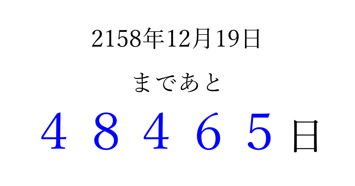 2158年12月19日(火)まで あと 99999 日です 追加すると、トップページからすぐ選べるようになります ※2026/04/10現在の結果です。 最新の状態に更新する ↓シェアして、タイムライン上にカウントダウンを表示しよう!↓ 📤 この結果を共有する Tweet シェア Threads Bluesky 別の日付でカウントダウン 2158年12月のカレンダー このページをブックマークに追加すると、いつでもカウントダウンを確認できます。 (PC: Ctrl+D / Mac: ⌘+D) hitome-notes.comでは以下のページも運営しています。 指定日と期間から日付を計算 | ガチャ確率計算・シミュレーション | プライバシー・ポリシー 運営者:Avocado