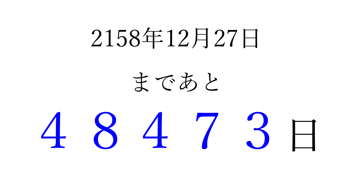 2158年12月27日(水)まで あと 99999 日です 追加すると、トップページからすぐ選べるようになります ※2026/04/10現在の結果です。 最新の状態に更新する ↓シェアして、タイムライン上にカウントダウンを表示しよう!↓ 📤 この結果を共有する Tweet シェア Threads Bluesky 別の日付でカウントダウン 2158年12月のカレンダー このページをブックマークに追加すると、いつでもカウントダウンを確認できます。 (PC: Ctrl+D / Mac: ⌘+D) hitome-notes.comでは以下のページも運営しています。 指定日と期間から日付を計算 | ガチャ確率計算・シミュレーション | プライバシー・ポリシー 運営者:Avocado