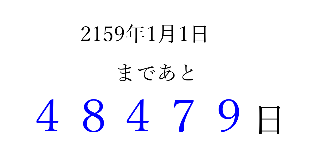 2159年1月1日(月)まで あと 99999 日です 追加すると、トップページからすぐ選べるようになります ※2026/04/09現在の結果です。 最新の状態に更新する ↓シェアして、タイムライン上にカウントダウンを表示しよう!↓ 📤 この結果を共有する Tweet シェア Threads Bluesky 別の日付でカウントダウン 2159年1月のカレンダー このページをブックマークに追加すると、いつでもカウントダウンを確認できます。 (PC: Ctrl+D / Mac: ⌘+D) hitome-notes.comでは以下のページも運営しています。 指定日と期間から日付を計算 | ガチャ確率計算・シミュレーション | プライバシー・ポリシー 運営者:Avocado