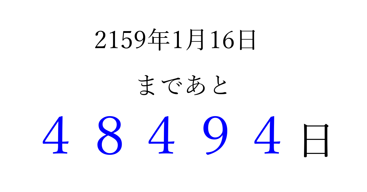 2159年1月16日(火)まで あと 99999 日です 追加すると、トップページからすぐ選べるようになります ※2026/04/09現在の結果です。 最新の状態に更新する ↓シェアして、タイムライン上にカウントダウンを表示しよう!↓ 📤 この結果を共有する Tweet シェア Threads Bluesky 別の日付でカウントダウン 2159年1月のカレンダー このページをブックマークに追加すると、いつでもカウントダウンを確認できます。 (PC: Ctrl+D / Mac: ⌘+D) hitome-notes.comでは以下のページも運営しています。 指定日と期間から日付を計算 | ガチャ確率計算・シミュレーション | プライバシー・ポリシー 運営者:Avocado