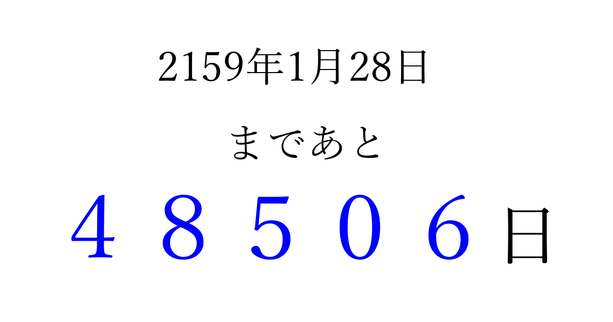 2159年1月28日(日)まで あと 99999 日です 追加すると、トップページからすぐ選べるようになります ※2026/04/09現在の結果です。 最新の状態に更新する ↓シェアして、タイムライン上にカウントダウンを表示しよう!↓ 📤 この結果を共有する Tweet シェア Threads Bluesky 別の日付でカウントダウン 2159年1月のカレンダー このページをブックマークに追加すると、いつでもカウントダウンを確認できます。 (PC: Ctrl+D / Mac: ⌘+D) hitome-notes.comでは以下のページも運営しています。 指定日と期間から日付を計算 | ガチャ確率計算・シミュレーション | プライバシー・ポリシー 運営者:Avocado