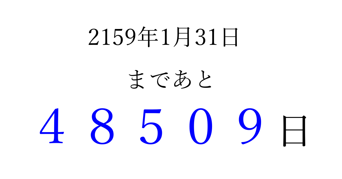 2159年1月31日(水)まで あと 99999 日です 追加すると、トップページからすぐ選べるようになります ※2026/04/09現在の結果です。 最新の状態に更新する ↓シェアして、タイムライン上にカウントダウンを表示しよう!↓ 📤 この結果を共有する Tweet シェア Threads Bluesky 別の日付でカウントダウン 2159年1月のカレンダー このページをブックマークに追加すると、いつでもカウントダウンを確認できます。 (PC: Ctrl+D / Mac: ⌘+D) hitome-notes.comでは以下のページも運営しています。 指定日と期間から日付を計算 | ガチャ確率計算・シミュレーション | プライバシー・ポリシー 運営者:Avocado
