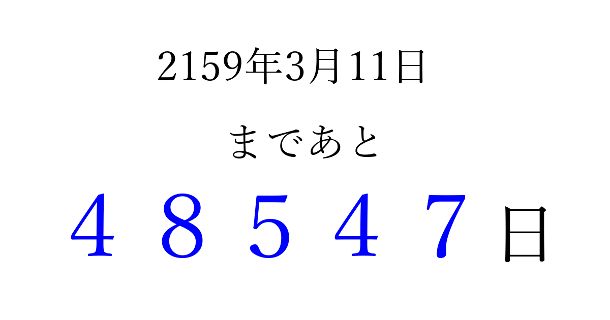2159年3月11日(日)まで あと 99999 日です 追加すると、トップページからすぐ選べるようになります ※2026/04/10現在の結果です。 最新の状態に更新する ↓シェアして、タイムライン上にカウントダウンを表示しよう!↓ 📤 この結果を共有する Tweet シェア Threads Bluesky 別の日付でカウントダウン 2159年3月のカレンダー このページをブックマークに追加すると、いつでもカウントダウンを確認できます。 (PC: Ctrl+D / Mac: ⌘+D) hitome-notes.comでは以下のページも運営しています。 指定日と期間から日付を計算 | ガチャ確率計算・シミュレーション | プライバシー・ポリシー 運営者:Avocado