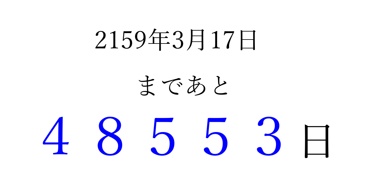 2159年3月17日(土)まで あと 99999 日です 追加すると、トップページからすぐ選べるようになります ※2026/04/10現在の結果です。 最新の状態に更新する ↓シェアして、タイムライン上にカウントダウンを表示しよう!↓ 📤 この結果を共有する Tweet シェア Threads Bluesky 別の日付でカウントダウン 2159年3月のカレンダー このページをブックマークに追加すると、いつでもカウントダウンを確認できます。 (PC: Ctrl+D / Mac: ⌘+D) hitome-notes.comでは以下のページも運営しています。 指定日と期間から日付を計算 | ガチャ確率計算・シミュレーション | プライバシー・ポリシー 運営者:Avocado
