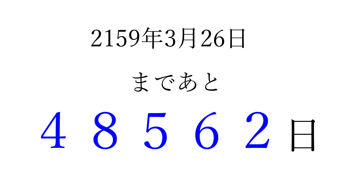 2159年3月26日(月)まで あと 99999 日です 追加すると、トップページからすぐ選べるようになります ※2026/04/10現在の結果です。 最新の状態に更新する ↓シェアして、タイムライン上にカウントダウンを表示しよう!↓ 📤 この結果を共有する Tweet シェア Threads Bluesky 別の日付でカウントダウン 2159年3月のカレンダー このページをブックマークに追加すると、いつでもカウントダウンを確認できます。 (PC: Ctrl+D / Mac: ⌘+D) hitome-notes.comでは以下のページも運営しています。 指定日と期間から日付を計算 | ガチャ確率計算・シミュレーション | プライバシー・ポリシー 運営者:Avocado
