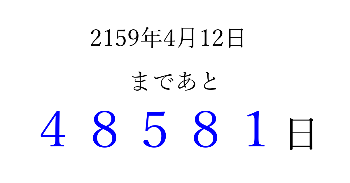 2159年4月12日(木)まで あと 99999 日です 追加すると、トップページからすぐ選べるようになります ※2026/04/08現在の結果です。 最新の状態に更新する ↓シェアして、タイムライン上にカウントダウンを表示しよう!↓ 📤 この結果を共有する Tweet シェア Threads Bluesky 別の日付でカウントダウン 2159年4月のカレンダー このページをブックマークに追加すると、いつでもカウントダウンを確認できます。 (PC: Ctrl+D / Mac: ⌘+D) hitome-notes.comでは以下のページも運営しています。 指定日と期間から日付を計算 | ガチャ確率計算・シミュレーション | プライバシー・ポリシー 運営者:Avocado