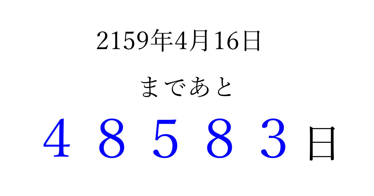 2159年4月16日(月)まで あと 99999 日です 追加すると、トップページからすぐ選べるようになります ※2026/04/10現在の結果です。 最新の状態に更新する ↓シェアして、タイムライン上にカウントダウンを表示しよう!↓ 📤 この結果を共有する Tweet シェア Threads Bluesky 別の日付でカウントダウン 2159年4月のカレンダー このページをブックマークに追加すると、いつでもカウントダウンを確認できます。 (PC: Ctrl+D / Mac: ⌘+D) hitome-notes.comでは以下のページも運営しています。 指定日と期間から日付を計算 | ガチャ確率計算・シミュレーション | プライバシー・ポリシー 運営者:Avocado