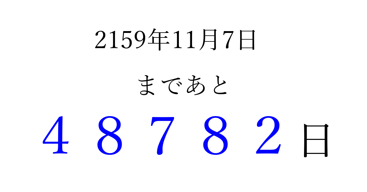 2159年11月7日(水)まで あと 99999 日です 追加すると、トップページからすぐ選べるようになります ※2026/04/16現在の結果です。 最新の状態に更新する ↓シェアして、タイムライン上にカウントダウンを表示しよう!↓ 📤 この結果を共有する Tweet シェア Threads Bluesky 別の日付でカウントダウン 2159年11月のカレンダー このページをブックマークに追加すると、いつでもカウントダウンを確認できます。 (PC: Ctrl+D / Mac: ⌘+D) hitome-notes.comでは以下のページも運営しています。 指定日と期間から日付を計算 | ガチャ確率計算・シミュレーション | プライバシー・ポリシー 運営者:Avocado