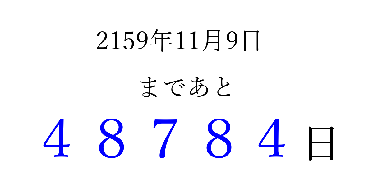 2159年11月9日(金)まで あと 99999 日です 追加すると、トップページからすぐ選べるようになります ※2026/04/16現在の結果です。 最新の状態に更新する ↓シェアして、タイムライン上にカウントダウンを表示しよう!↓ 📤 この結果を共有する Tweet シェア Threads Bluesky 別の日付でカウントダウン 2159年11月のカレンダー このページをブックマークに追加すると、いつでもカウントダウンを確認できます。 (PC: Ctrl+D / Mac: ⌘+D) hitome-notes.comでは以下のページも運営しています。 指定日と期間から日付を計算 | ガチャ確率計算・シミュレーション | プライバシー・ポリシー 運営者:Avocado