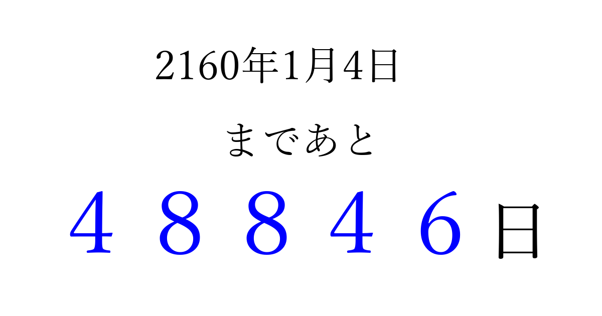 2160年1月4日(金)まで あと 99999 日です 追加すると、トップページからすぐ選べるようになります ※2026/04/10現在の結果です。 最新の状態に更新する ↓シェアして、タイムライン上にカウントダウンを表示しよう!↓ 📤 この結果を共有する Tweet シェア Threads Bluesky 別の日付でカウントダウン 2160年1月のカレンダー このページをブックマークに追加すると、いつでもカウントダウンを確認できます。 (PC: Ctrl+D / Mac: ⌘+D) hitome-notes.comでは以下のページも運営しています。 指定日と期間から日付を計算 | ガチャ確率計算・シミュレーション | プライバシー・ポリシー 運営者:Avocado