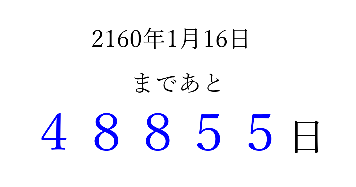 2160年1月16日(水)まで あと 99999 日です 追加すると、トップページからすぐ選べるようになります ※2026/04/13現在の結果です。 最新の状態に更新する ↓シェアして、タイムライン上にカウントダウンを表示しよう!↓ 📤 この結果を共有する Tweet シェア Threads Bluesky 別の日付でカウントダウン 2160年1月のカレンダー このページをブックマークに追加すると、いつでもカウントダウンを確認できます。 (PC: Ctrl+D / Mac: ⌘+D) hitome-notes.comでは以下のページも運営しています。 指定日と期間から日付を計算 | ガチャ確率計算・シミュレーション | プライバシー・ポリシー 運営者:Avocado