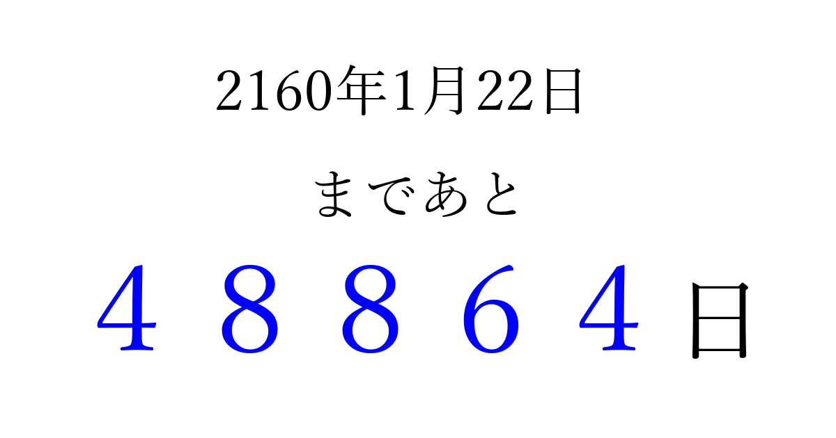 2160年1月22日(火)まで あと 99999 日です 追加すると、トップページからすぐ選べるようになります ※2026/04/10現在の結果です。 最新の状態に更新する ↓シェアして、タイムライン上にカウントダウンを表示しよう!↓ 📤 この結果を共有する Tweet シェア Threads Bluesky 別の日付でカウントダウン 2160年1月のカレンダー このページをブックマークに追加すると、いつでもカウントダウンを確認できます。 (PC: Ctrl+D / Mac: ⌘+D) hitome-notes.comでは以下のページも運営しています。 指定日と期間から日付を計算 | ガチャ確率計算・シミュレーション | プライバシー・ポリシー 運営者:Avocado
