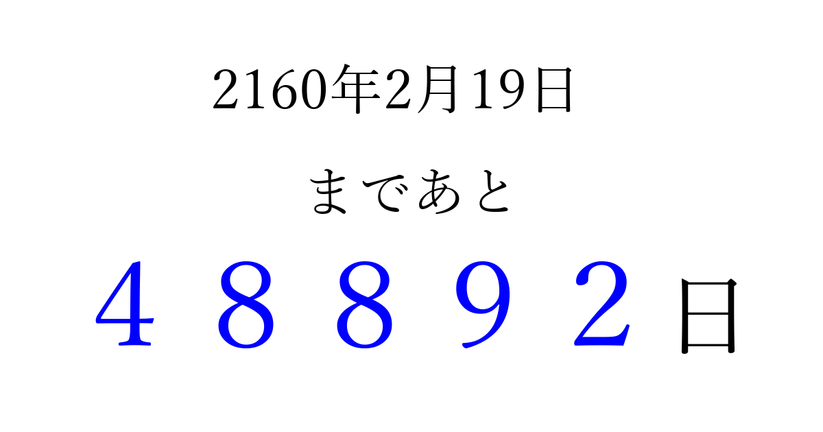 2160年2月19日(火)まで あと 99999 日です 追加すると、トップページからすぐ選べるようになります ※2026/04/10現在の結果です。 最新の状態に更新する ↓シェアして、タイムライン上にカウントダウンを表示しよう!↓ 📤 この結果を共有する Tweet シェア Threads Bluesky 別の日付でカウントダウン 2160年2月のカレンダー このページをブックマークに追加すると、いつでもカウントダウンを確認できます。 (PC: Ctrl+D / Mac: ⌘+D) hitome-notes.comでは以下のページも運営しています。 指定日と期間から日付を計算 | ガチャ確率計算・シミュレーション | プライバシー・ポリシー 運営者:Avocado