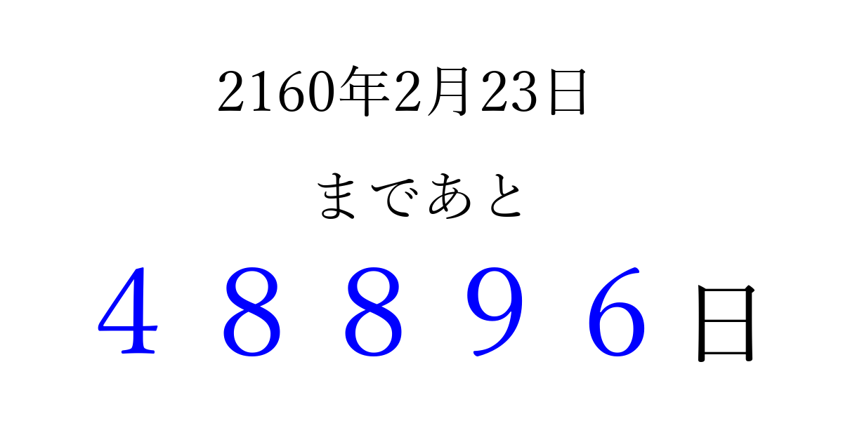 2160年2月23日(土)まで あと 99999 日です 追加すると、トップページからすぐ選べるようになります ※2026/04/10現在の結果です。 最新の状態に更新する ↓シェアして、タイムライン上にカウントダウンを表示しよう!↓ 📤 この結果を共有する Tweet シェア Threads Bluesky 別の日付でカウントダウン 2160年2月のカレンダー このページをブックマークに追加すると、いつでもカウントダウンを確認できます。 (PC: Ctrl+D / Mac: ⌘+D) hitome-notes.comでは以下のページも運営しています。 指定日と期間から日付を計算 | ガチャ確率計算・シミュレーション | プライバシー・ポリシー 運営者:Avocado