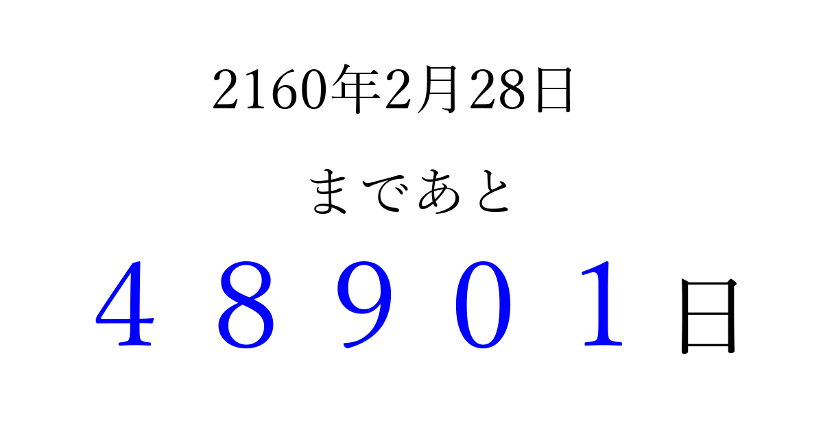 2160年2月28日(木)まで あと 99999 日です 追加すると、トップページからすぐ選べるようになります ※2026/04/10現在の結果です。 最新の状態に更新する ↓シェアして、タイムライン上にカウントダウンを表示しよう!↓ 📤 この結果を共有する Tweet シェア Threads Bluesky 別の日付でカウントダウン 2160年2月のカレンダー このページをブックマークに追加すると、いつでもカウントダウンを確認できます。 (PC: Ctrl+D / Mac: ⌘+D) hitome-notes.comでは以下のページも運営しています。 指定日と期間から日付を計算 | ガチャ確率計算・シミュレーション | プライバシー・ポリシー 運営者:Avocado