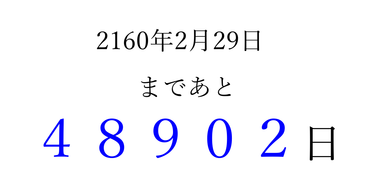 2160年2月29日(金)まで あと 99999 日です 追加すると、トップページからすぐ選べるようになります ※2026/04/10現在の結果です。 最新の状態に更新する ↓シェアして、タイムライン上にカウントダウンを表示しよう!↓ 📤 この結果を共有する Tweet シェア Threads Bluesky 別の日付でカウントダウン 2160年2月のカレンダー このページをブックマークに追加すると、いつでもカウントダウンを確認できます。 (PC: Ctrl+D / Mac: ⌘+D) hitome-notes.comでは以下のページも運営しています。 指定日と期間から日付を計算 | ガチャ確率計算・シミュレーション | プライバシー・ポリシー 運営者:Avocado
