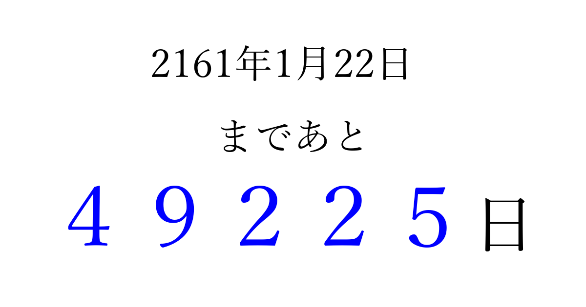 2161年1月22日(木)まで あと 99999 日です 追加すると、トップページからすぐ選べるようになります ※2026/04/15現在の結果です。 最新の状態に更新する ↓シェアして、タイムライン上にカウントダウンを表示しよう!↓ 📤 この結果を共有する Tweet シェア Threads Bluesky 別の日付でカウントダウン 2161年1月のカレンダー このページをブックマークに追加すると、いつでもカウントダウンを確認できます。 (PC: Ctrl+D / Mac: ⌘+D) hitome-notes.comでは以下のページも運営しています。 指定日と期間から日付を計算 | ガチャ確率計算・シミュレーション | プライバシー・ポリシー 運営者:Avocado