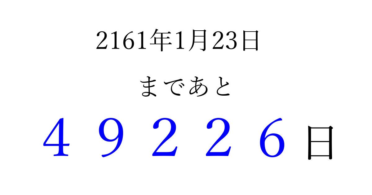 2161年1月23日(金)まで あと 99999 日です 追加すると、トップページからすぐ選べるようになります ※2026/04/15現在の結果です。 最新の状態に更新する ↓シェアして、タイムライン上にカウントダウンを表示しよう!↓ 📤 この結果を共有する Tweet シェア Threads Bluesky 別の日付でカウントダウン 2161年1月のカレンダー このページをブックマークに追加すると、いつでもカウントダウンを確認できます。 (PC: Ctrl+D / Mac: ⌘+D) hitome-notes.comでは以下のページも運営しています。 指定日と期間から日付を計算 | ガチャ確率計算・シミュレーション | プライバシー・ポリシー 運営者:Avocado