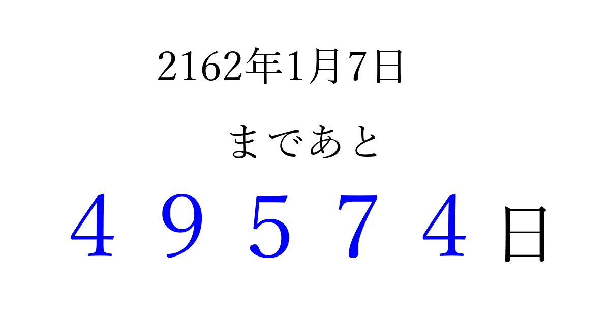 2162年1月7日(木)まで あと 99999 日です 追加すると、トップページからすぐ選べるようになります ※2026/04/16現在の結果です。 最新の状態に更新する ↓シェアして、タイムライン上にカウントダウンを表示しよう!↓ 📤 この結果を共有する Tweet シェア Threads Bluesky 別の日付でカウントダウン 2162年1月のカレンダー このページをブックマークに追加すると、いつでもカウントダウンを確認できます。 (PC: Ctrl+D / Mac: ⌘+D) hitome-notes.comでは以下のページも運営しています。 指定日と期間から日付を計算 | ガチャ確率計算・シミュレーション | プライバシー・ポリシー 運営者:Avocado