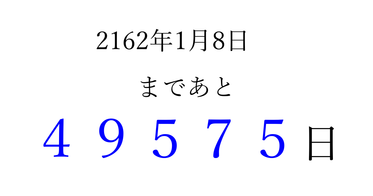 2162年1月8日(金)まで あと 99999 日です 追加すると、トップページからすぐ選べるようになります ※2026/04/16現在の結果です。 最新の状態に更新する ↓シェアして、タイムライン上にカウントダウンを表示しよう!↓ 📤 この結果を共有する Tweet シェア Threads Bluesky 別の日付でカウントダウン 2162年1月のカレンダー このページをブックマークに追加すると、いつでもカウントダウンを確認できます。 (PC: Ctrl+D / Mac: ⌘+D) hitome-notes.comでは以下のページも運営しています。 指定日と期間から日付を計算 | ガチャ確率計算・シミュレーション | プライバシー・ポリシー 運営者:Avocado