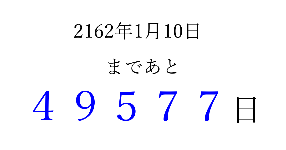 2162年1月10日(日)まで あと 99999 日です 追加すると、トップページからすぐ選べるようになります ※2026/04/16現在の結果です。 最新の状態に更新する ↓シェアして、タイムライン上にカウントダウンを表示しよう!↓ 📤 この結果を共有する Tweet シェア Threads Bluesky 別の日付でカウントダウン 2162年1月のカレンダー このページをブックマークに追加すると、いつでもカウントダウンを確認できます。 (PC: Ctrl+D / Mac: ⌘+D) hitome-notes.comでは以下のページも運営しています。 指定日と期間から日付を計算 | ガチャ確率計算・シミュレーション | プライバシー・ポリシー 運営者:Avocado