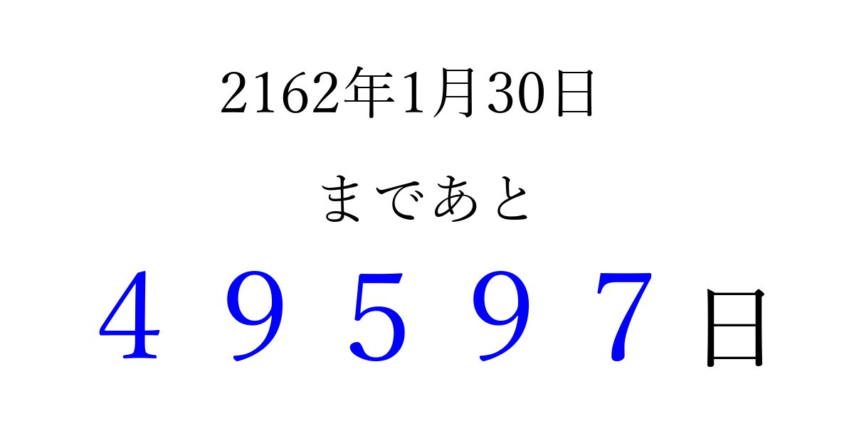 2162年1月30日(土)まで あと 99999 日です 追加すると、トップページからすぐ選べるようになります ※2026/04/16現在の結果です。 最新の状態に更新する ↓シェアして、タイムライン上にカウントダウンを表示しよう!↓ 📤 この結果を共有する Tweet シェア Threads Bluesky 別の日付でカウントダウン 2162年1月のカレンダー このページをブックマークに追加すると、いつでもカウントダウンを確認できます。 (PC: Ctrl+D / Mac: ⌘+D) hitome-notes.comでは以下のページも運営しています。 指定日と期間から日付を計算 | ガチャ確率計算・シミュレーション | プライバシー・ポリシー 運営者:Avocado