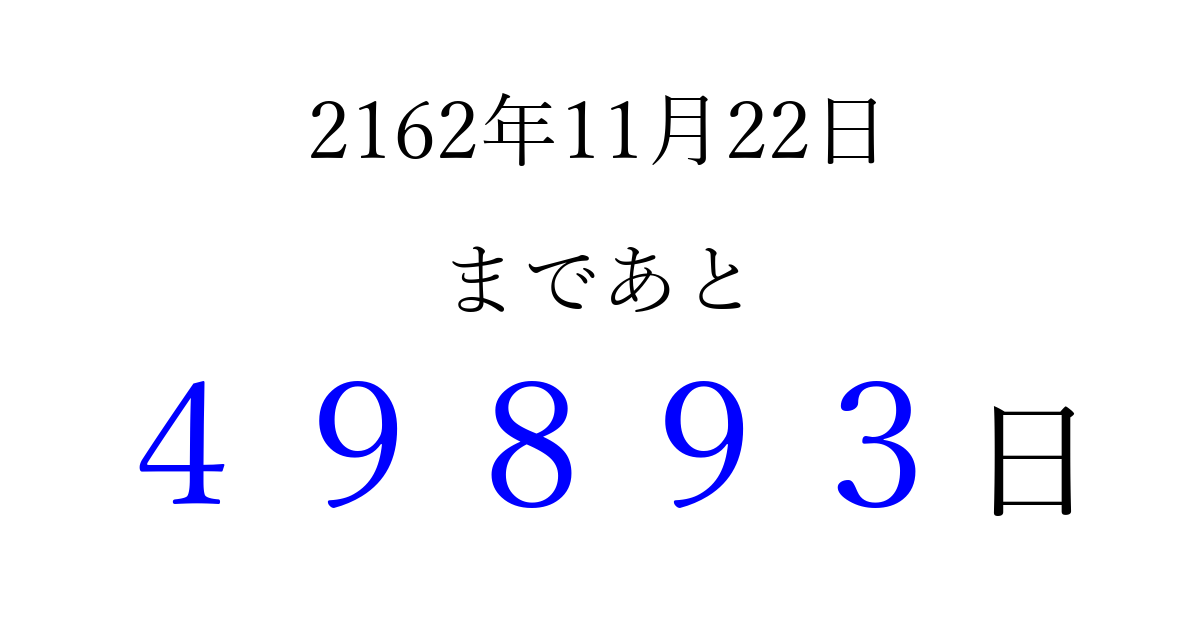 2162年11月22日(月)まで あと 99999 日です 追加すると、トップページからすぐ選べるようになります ※2026/04/16現在の結果です。 最新の状態に更新する ↓シェアして、タイムライン上にカウントダウンを表示しよう!↓ 📤 この結果を共有する Tweet シェア Threads Bluesky 別の日付でカウントダウン 2162年11月のカレンダー このページをブックマークに追加すると、いつでもカウントダウンを確認できます。 (PC: Ctrl+D / Mac: ⌘+D) hitome-notes.comでは以下のページも運営しています。 指定日と期間から日付を計算 | ガチャ確率計算・シミュレーション | プライバシー・ポリシー 運営者:Avocado
