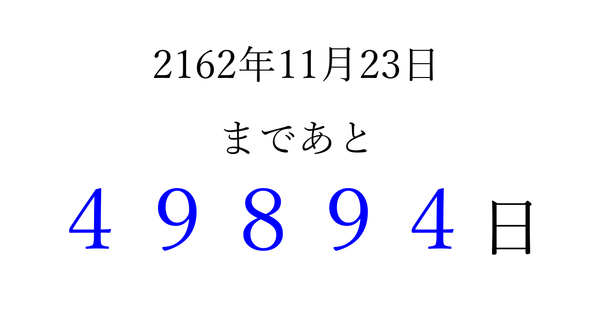 2162年11月23日(火)まで あと 99999 日です 追加すると、トップページからすぐ選べるようになります ※2026/04/16現在の結果です。 最新の状態に更新する ↓シェアして、タイムライン上にカウントダウンを表示しよう!↓ 📤 この結果を共有する Tweet シェア Threads Bluesky 別の日付でカウントダウン 2162年11月のカレンダー このページをブックマークに追加すると、いつでもカウントダウンを確認できます。 (PC: Ctrl+D / Mac: ⌘+D) hitome-notes.comでは以下のページも運営しています。 指定日と期間から日付を計算 | ガチャ確率計算・シミュレーション | プライバシー・ポリシー 運営者:Avocado