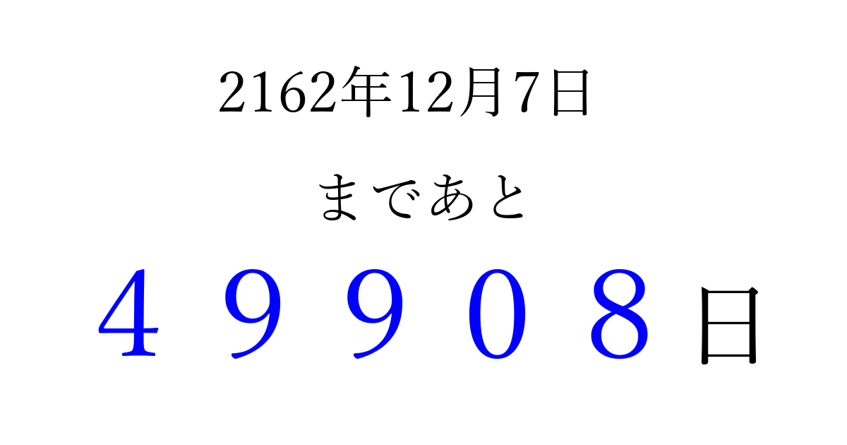 2162年12月7日(火)まで あと 99999 日です 追加すると、トップページからすぐ選べるようになります ※2026/04/16現在の結果です。 最新の状態に更新する ↓シェアして、タイムライン上にカウントダウンを表示しよう!↓ 📤 この結果を共有する Tweet シェア Threads Bluesky 別の日付でカウントダウン 2162年12月のカレンダー このページをブックマークに追加すると、いつでもカウントダウンを確認できます。 (PC: Ctrl+D / Mac: ⌘+D) hitome-notes.comでは以下のページも運営しています。 指定日と期間から日付を計算 | ガチャ確率計算・シミュレーション | プライバシー・ポリシー 運営者:Avocado