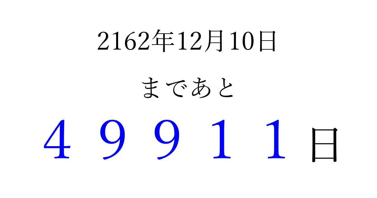 2162年12月10日(金)まで あと 99999 日です 追加すると、トップページからすぐ選べるようになります ※2026/04/16現在の結果です。 最新の状態に更新する ↓シェアして、タイムライン上にカウントダウンを表示しよう!↓ 📤 この結果を共有する Tweet シェア Threads Bluesky 別の日付でカウントダウン 2162年12月のカレンダー このページをブックマークに追加すると、いつでもカウントダウンを確認できます。 (PC: Ctrl+D / Mac: ⌘+D) hitome-notes.comでは以下のページも運営しています。 指定日と期間から日付を計算 | ガチャ確率計算・シミュレーション | プライバシー・ポリシー 運営者:Avocado