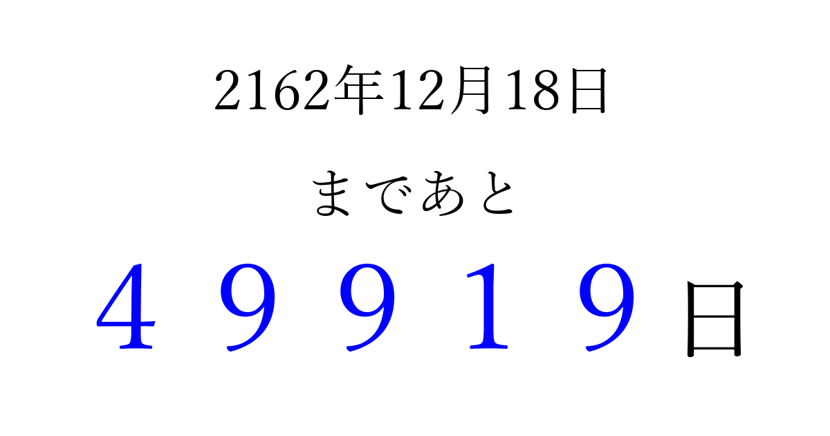 2162年12月18日(土)まで あと 99999 日です 追加すると、トップページからすぐ選べるようになります ※2026/04/16現在の結果です。 最新の状態に更新する ↓シェアして、タイムライン上にカウントダウンを表示しよう!↓ 📤 この結果を共有する Tweet シェア Threads Bluesky 別の日付でカウントダウン 2162年12月のカレンダー このページをブックマークに追加すると、いつでもカウントダウンを確認できます。 (PC: Ctrl+D / Mac: ⌘+D) hitome-notes.comでは以下のページも運営しています。 指定日と期間から日付を計算 | ガチャ確率計算・シミュレーション | プライバシー・ポリシー 運営者:Avocado