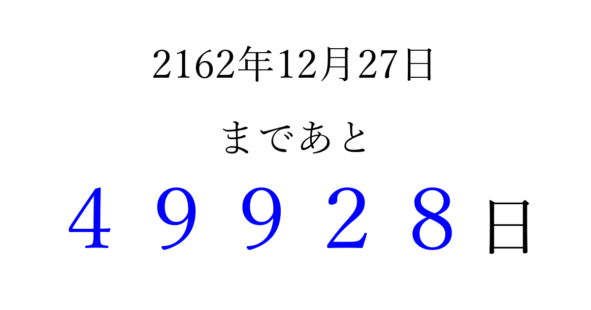 2162年12月27日(月)まで あと 99999 日です 追加すると、トップページからすぐ選べるようになります ※2026/04/16現在の結果です。 最新の状態に更新する ↓シェアして、タイムライン上にカウントダウンを表示しよう!↓ 📤 この結果を共有する Tweet シェア Threads Bluesky 別の日付でカウントダウン 2162年12月のカレンダー このページをブックマークに追加すると、いつでもカウントダウンを確認できます。 (PC: Ctrl+D / Mac: ⌘+D) hitome-notes.comでは以下のページも運営しています。 指定日と期間から日付を計算 | ガチャ確率計算・シミュレーション | プライバシー・ポリシー 運営者:Avocado