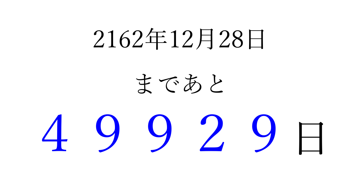 2162年12月28日(火)まで あと 99999 日です 追加すると、トップページからすぐ選べるようになります ※2026/04/16現在の結果です。 最新の状態に更新する ↓シェアして、タイムライン上にカウントダウンを表示しよう!↓ 📤 この結果を共有する Tweet シェア Threads Bluesky 別の日付でカウントダウン 2162年12月のカレンダー このページをブックマークに追加すると、いつでもカウントダウンを確認できます。 (PC: Ctrl+D / Mac: ⌘+D) hitome-notes.comでは以下のページも運営しています。 指定日と期間から日付を計算 | ガチャ確率計算・シミュレーション | プライバシー・ポリシー 運営者:Avocado