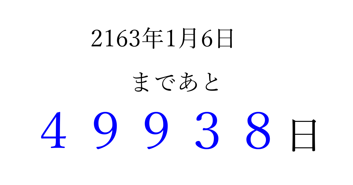 2163年1月6日(木)まで あと 99999 日です 追加すると、トップページからすぐ選べるようになります ※2026/04/16現在の結果です。 最新の状態に更新する ↓シェアして、タイムライン上にカウントダウンを表示しよう!↓ 📤 この結果を共有する Tweet シェア Threads Bluesky 別の日付でカウントダウン 2163年1月のカレンダー このページをブックマークに追加すると、いつでもカウントダウンを確認できます。 (PC: Ctrl+D / Mac: ⌘+D) hitome-notes.comでは以下のページも運営しています。 指定日と期間から日付を計算 | ガチャ確率計算・シミュレーション | プライバシー・ポリシー 運営者:Avocado