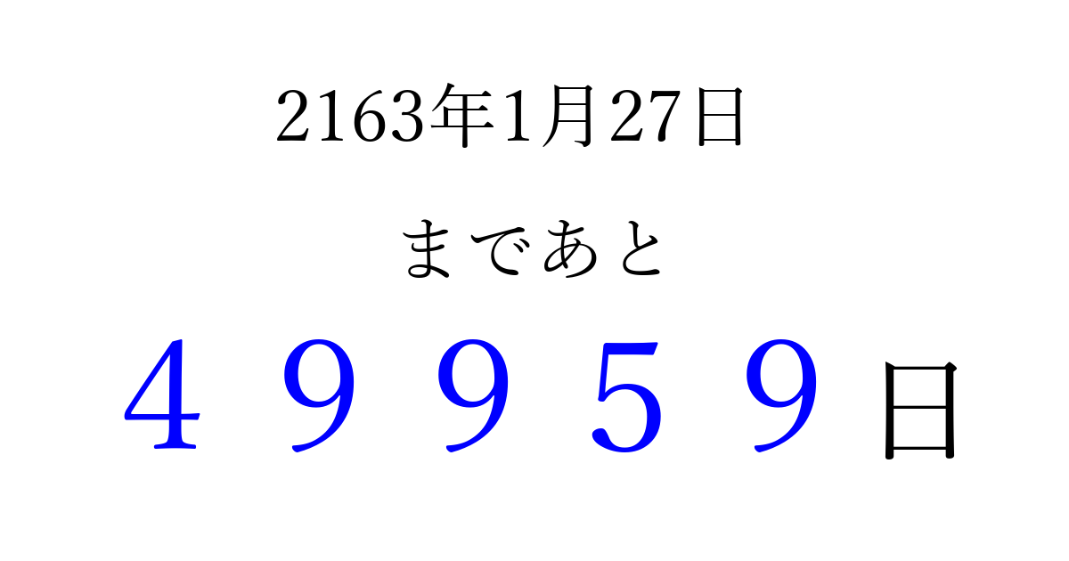 2163年1月27日(木)まで あと 99999 日です 追加すると、トップページからすぐ選べるようになります ※2026/04/16現在の結果です。 最新の状態に更新する ↓シェアして、タイムライン上にカウントダウンを表示しよう!↓ 📤 この結果を共有する Tweet シェア Threads Bluesky 別の日付でカウントダウン 2163年1月のカレンダー このページをブックマークに追加すると、いつでもカウントダウンを確認できます。 (PC: Ctrl+D / Mac: ⌘+D) hitome-notes.comでは以下のページも運営しています。 指定日と期間から日付を計算 | ガチャ確率計算・シミュレーション | プライバシー・ポリシー 運営者:Avocado
