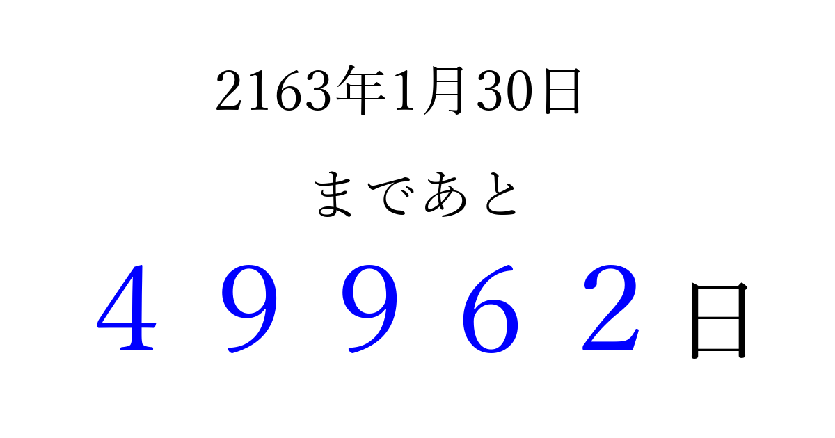 2163年1月30日(日)まで あと 99999 日です 追加すると、トップページからすぐ選べるようになります ※2026/04/16現在の結果です。 最新の状態に更新する ↓シェアして、タイムライン上にカウントダウンを表示しよう!↓ 📤 この結果を共有する Tweet シェア Threads Bluesky 別の日付でカウントダウン 2163年1月のカレンダー このページをブックマークに追加すると、いつでもカウントダウンを確認できます。 (PC: Ctrl+D / Mac: ⌘+D) hitome-notes.comでは以下のページも運営しています。 指定日と期間から日付を計算 | ガチャ確率計算・シミュレーション | プライバシー・ポリシー 運営者:Avocado
