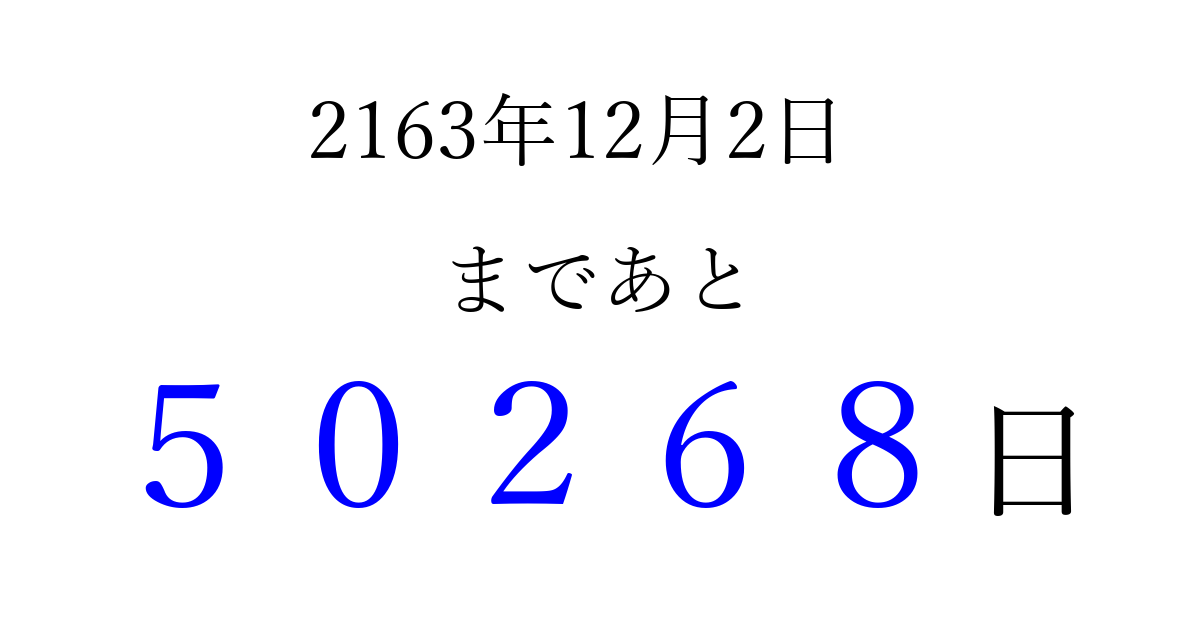 2163年12月2日(金)まで あと 99999 日です 追加すると、トップページからすぐ選べるようになります ※2026/04/16現在の結果です。 最新の状態に更新する ↓シェアして、タイムライン上にカウントダウンを表示しよう!↓ 📤 この結果を共有する Tweet シェア Threads Bluesky 別の日付でカウントダウン 2163年12月のカレンダー このページをブックマークに追加すると、いつでもカウントダウンを確認できます。 (PC: Ctrl+D / Mac: ⌘+D) hitome-notes.comでは以下のページも運営しています。 指定日と期間から日付を計算 | ガチャ確率計算・シミュレーション | プライバシー・ポリシー 運営者:Avocado