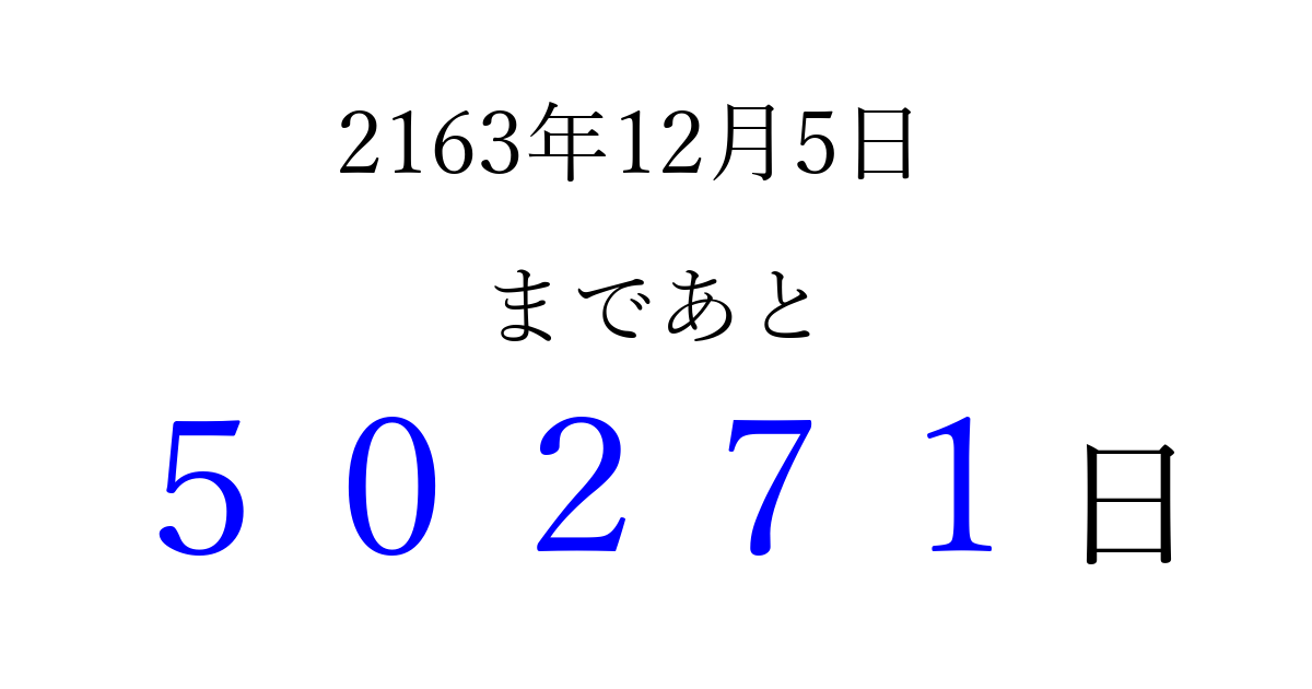 2163年12月5日(月)まで あと 99999 日です 追加すると、トップページからすぐ選べるようになります ※2026/04/16現在の結果です。 最新の状態に更新する ↓シェアして、タイムライン上にカウントダウンを表示しよう!↓ 📤 この結果を共有する Tweet シェア Threads Bluesky 別の日付でカウントダウン 2163年12月のカレンダー このページをブックマークに追加すると、いつでもカウントダウンを確認できます。 (PC: Ctrl+D / Mac: ⌘+D) hitome-notes.comでは以下のページも運営しています。 指定日と期間から日付を計算 | ガチャ確率計算・シミュレーション | プライバシー・ポリシー 運営者:Avocado