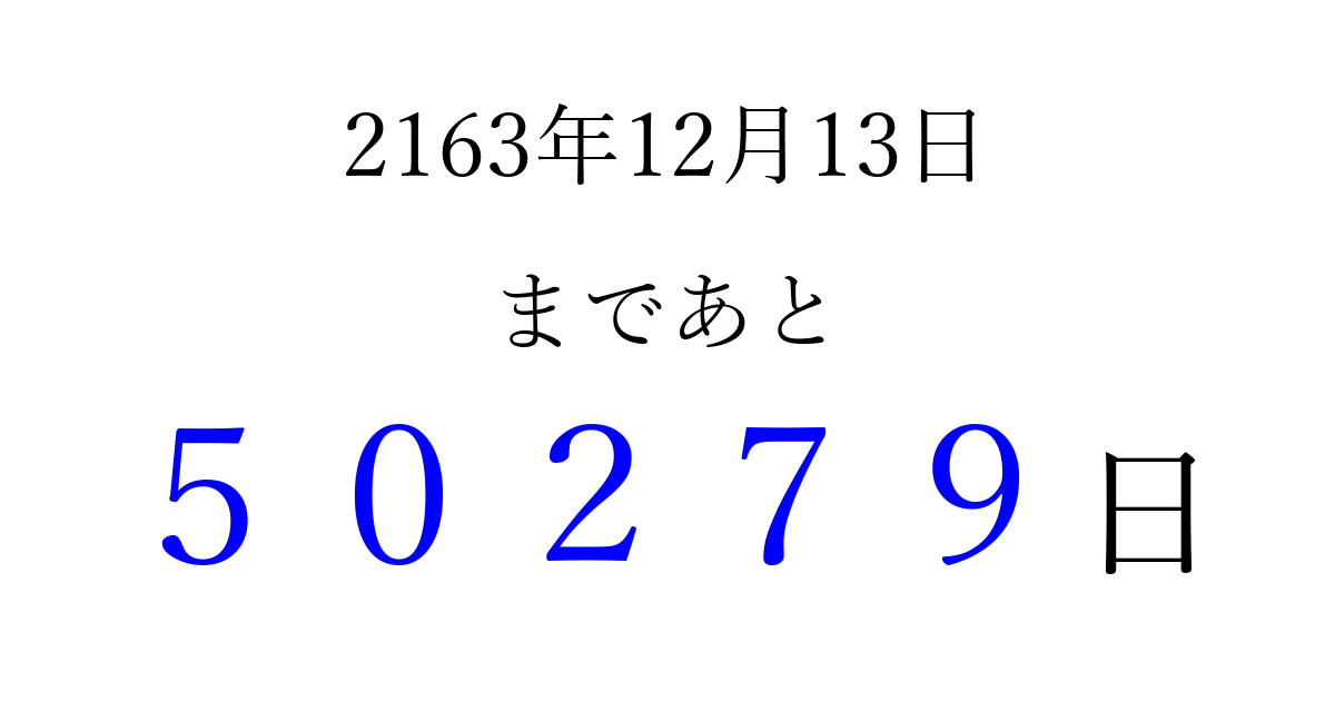 2163年12月13日(火)まで あと 99999 日です 追加すると、トップページからすぐ選べるようになります ※2026/04/16現在の結果です。 最新の状態に更新する ↓シェアして、タイムライン上にカウントダウンを表示しよう!↓ 📤 この結果を共有する Tweet シェア Threads Bluesky 別の日付でカウントダウン 2163年12月のカレンダー このページをブックマークに追加すると、いつでもカウントダウンを確認できます。 (PC: Ctrl+D / Mac: ⌘+D) hitome-notes.comでは以下のページも運営しています。 指定日と期間から日付を計算 | ガチャ確率計算・シミュレーション | プライバシー・ポリシー 運営者:Avocado