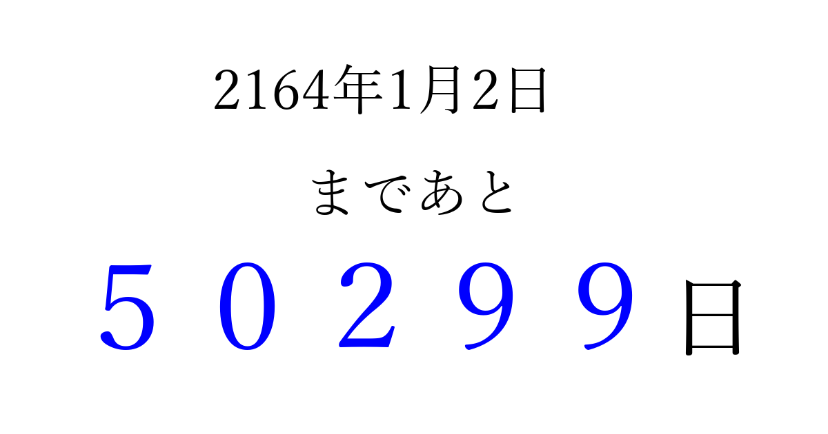 2164年1月2日(月)まで あと 99999 日です 追加すると、トップページからすぐ選べるようになります ※2026/04/16現在の結果です。 最新の状態に更新する ↓シェアして、タイムライン上にカウントダウンを表示しよう!↓ 📤 この結果を共有する Tweet シェア Threads Bluesky 別の日付でカウントダウン 2164年1月のカレンダー このページをブックマークに追加すると、いつでもカウントダウンを確認できます。 (PC: Ctrl+D / Mac: ⌘+D) hitome-notes.comでは以下のページも運営しています。 指定日と期間から日付を計算 | ガチャ確率計算・シミュレーション | プライバシー・ポリシー 運営者:Avocado